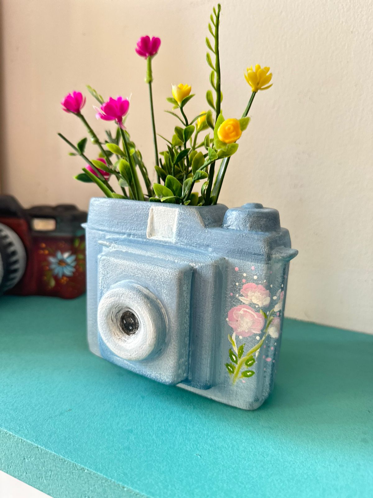 Matera doble uso de cerámica en forma de cámara fotográfica, pintada a mano con un diseño femenino floral. Linda, decorativa y utilitaria.