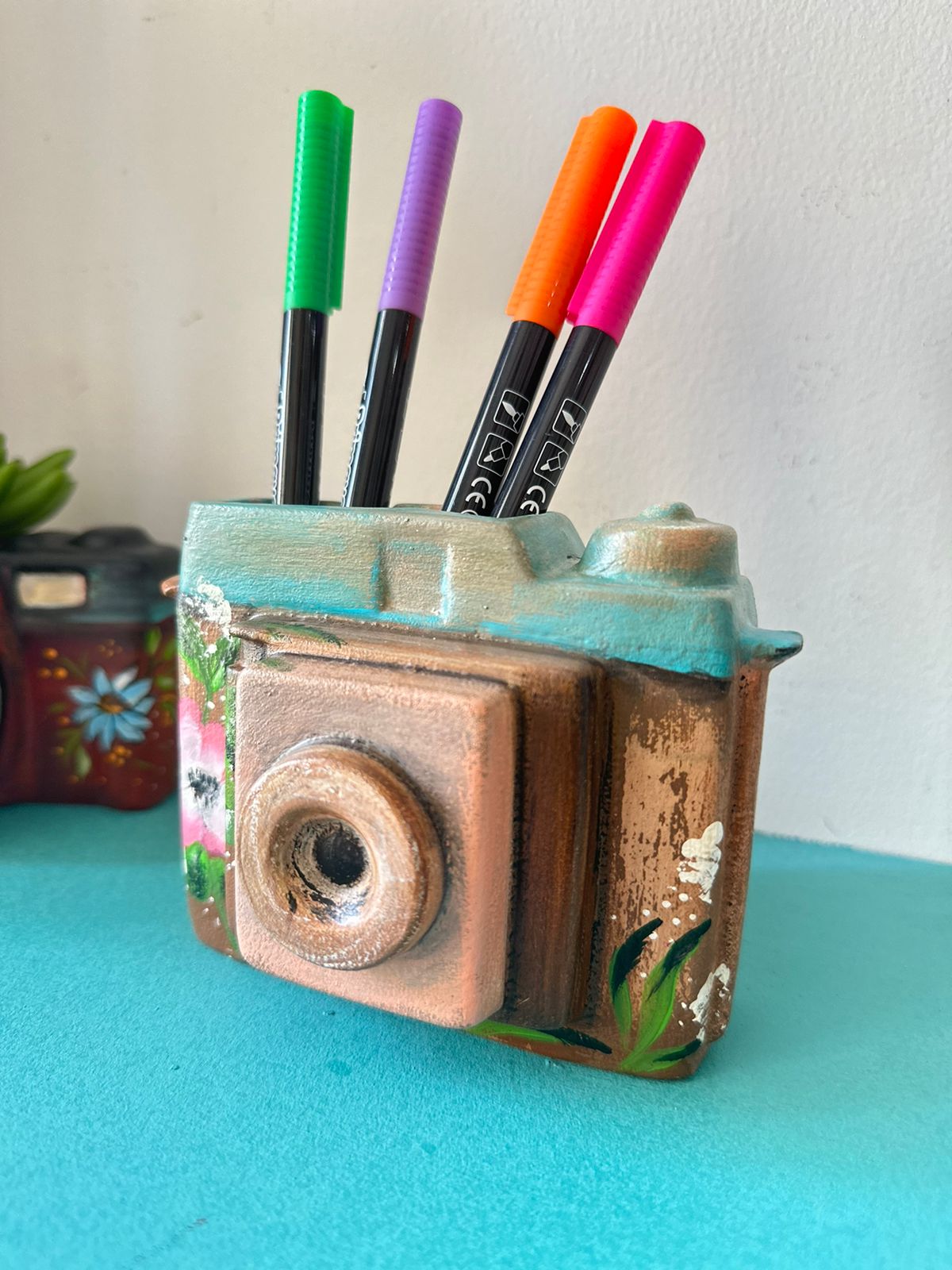 Matera doble uso de cerámica en forma de cámara fotográfica instantánea, pintada a mano con un diseño femenino floral. Linda, decorativa y utilitaria.