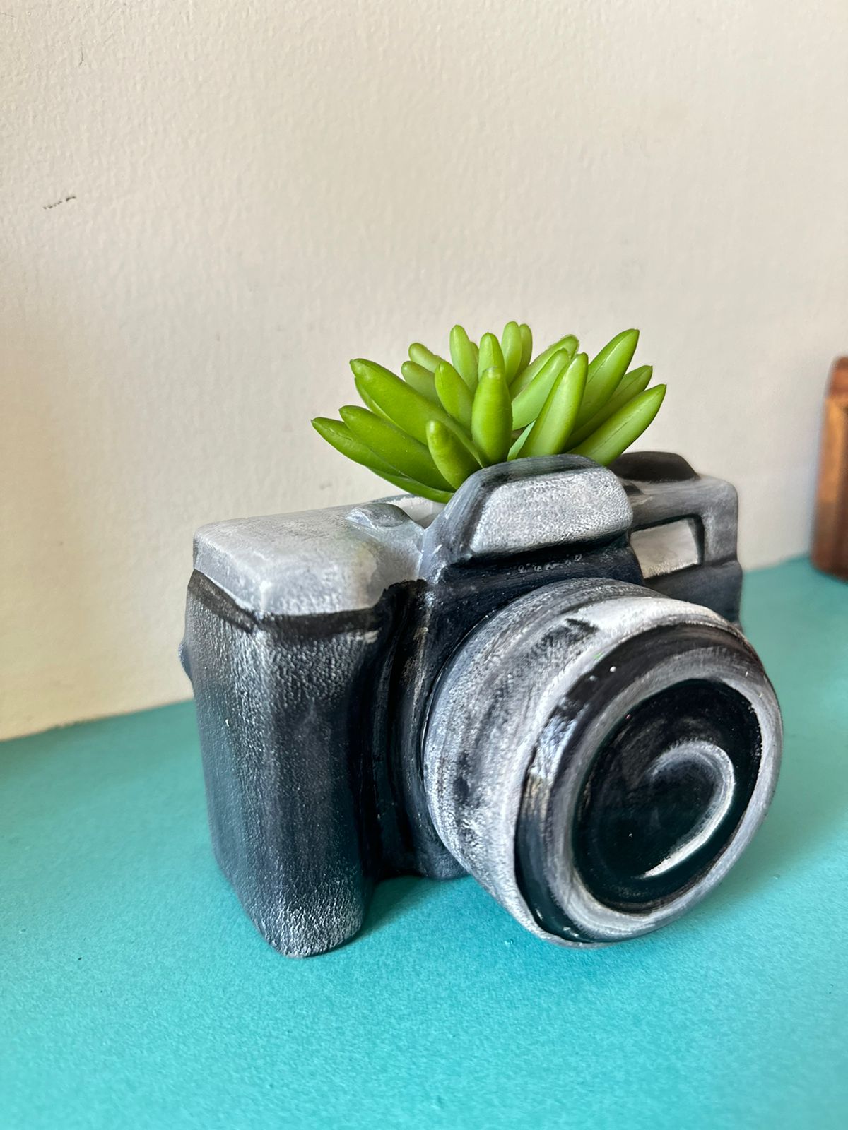 Matera doble uso de cerámica en forma de cámara fotográfica, pintada a mano con un diseño negro Clásico. Linda, decorativa y utilitaria.