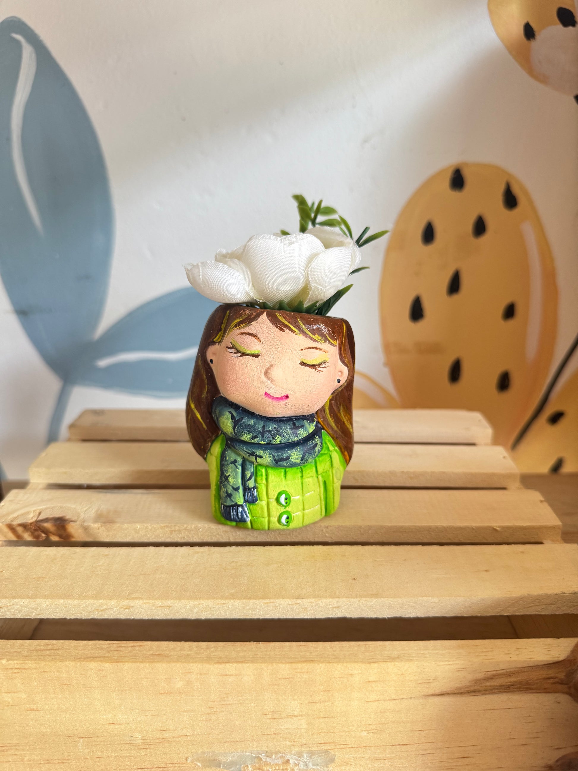 Matera en forma de mujercita, para suculentas o plantas pequeñas. Material en cerámica, pintada a mano. ideal para un regalo especial o decorar repisas.