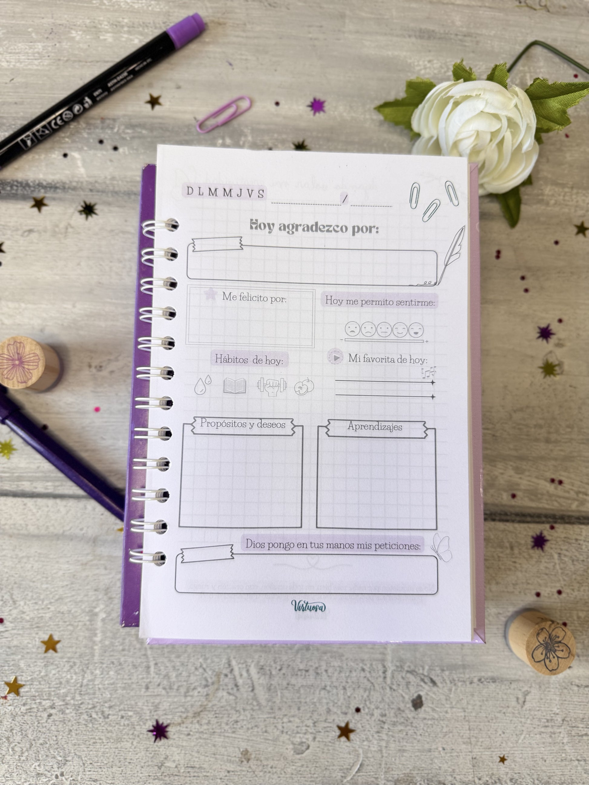 Libreta de gratitud y crecimiento personal para llenar. Medidas14 x 21 cm , tapas duras brillantes, hoja bolsillo, stickers, mapa de sueños, fechas especiales, calendario.