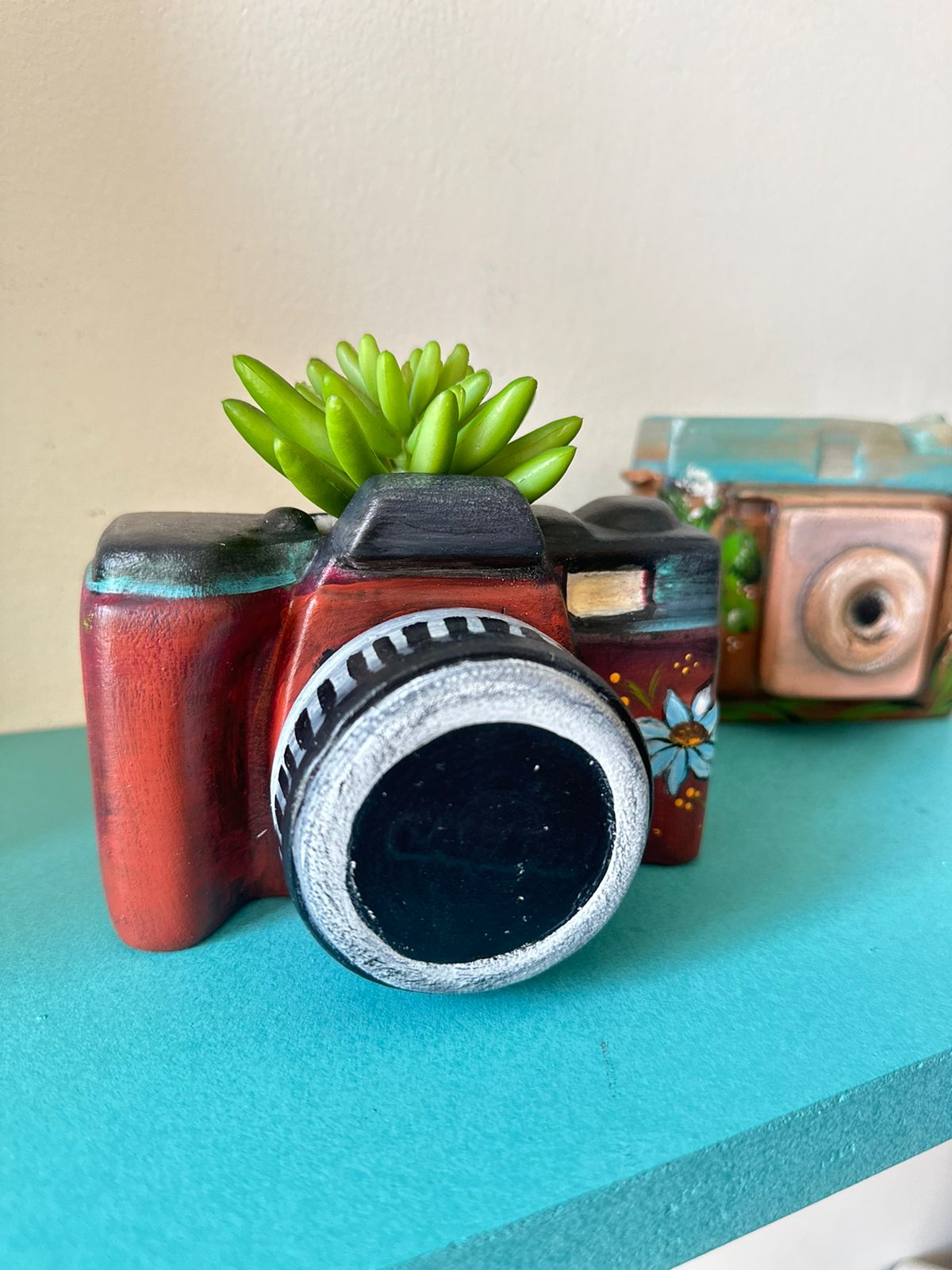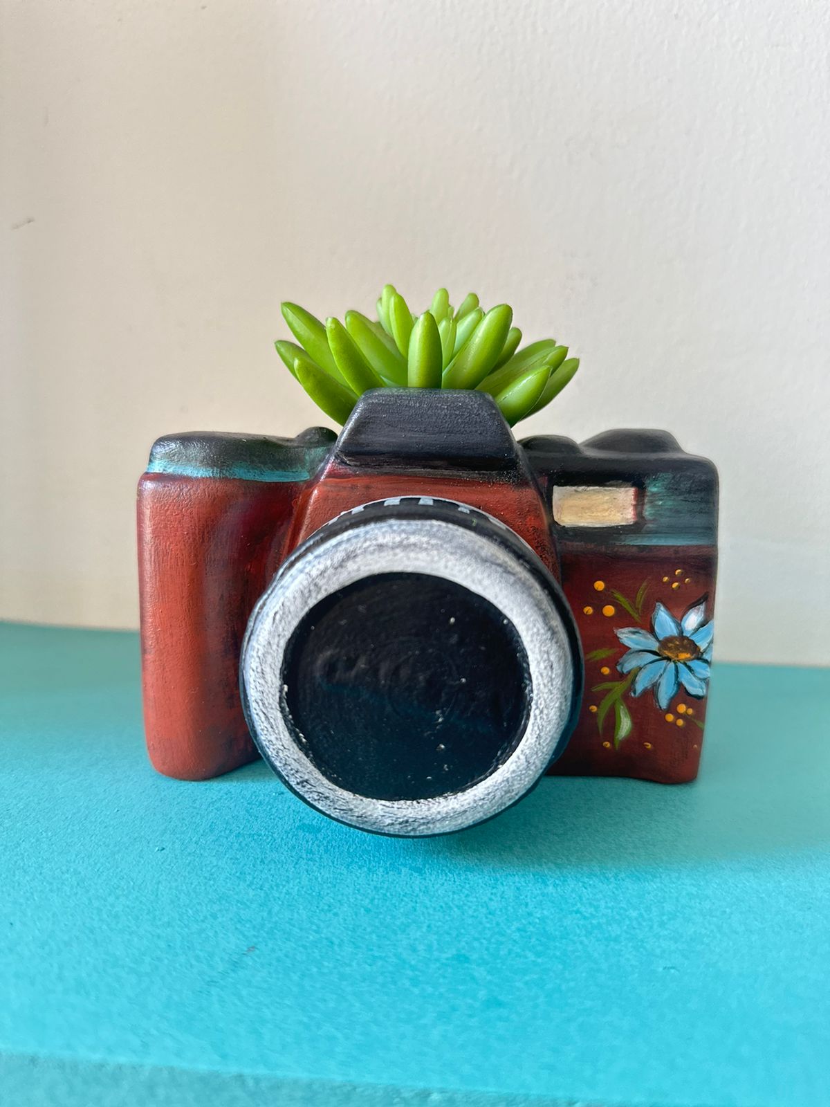 Matera doble uso de cerámica en forma de cámara fotográfica, pintada a mano con un diseño femenino floral. Linda, decorativa y utilitaria.