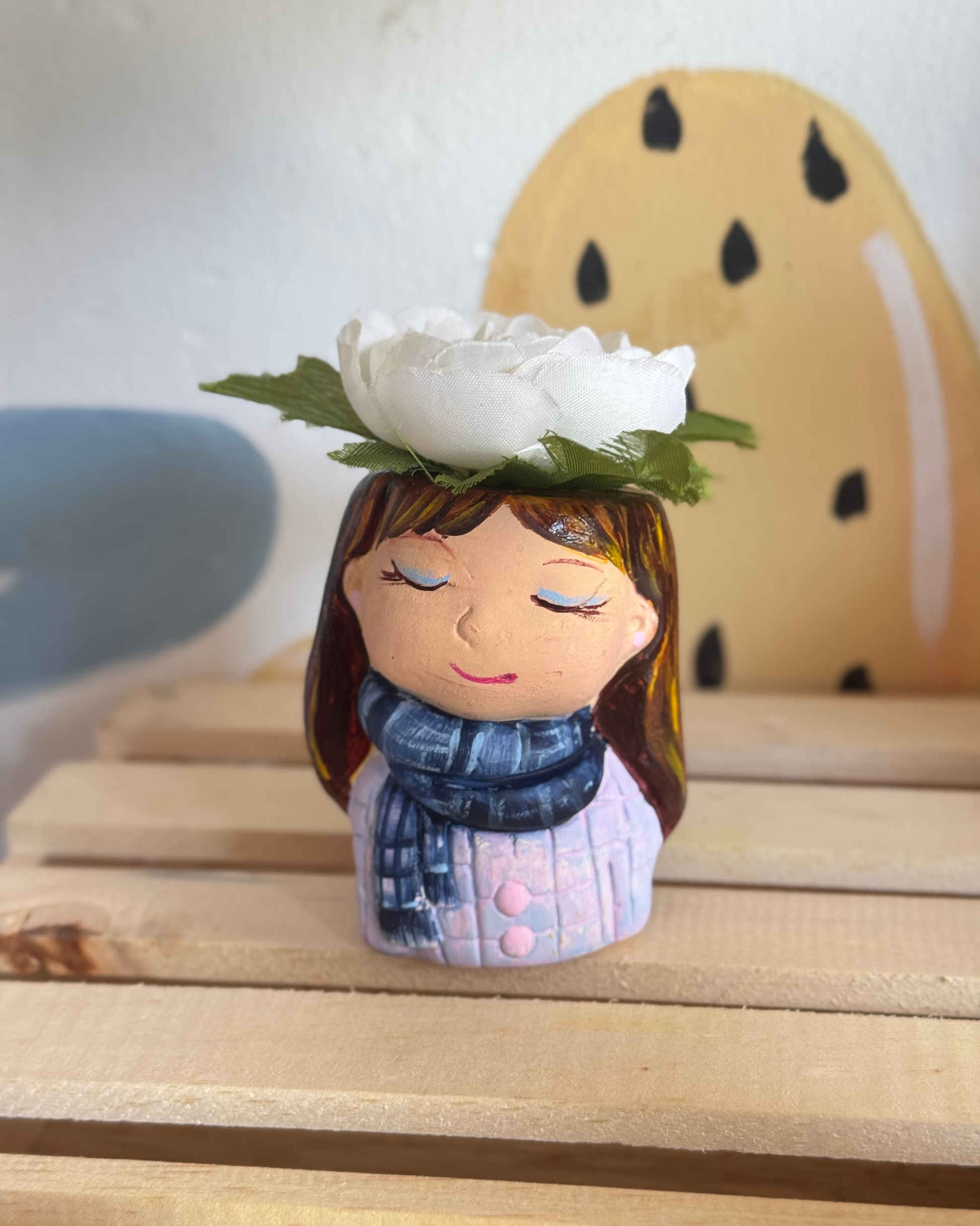 Matera en forma de mujercita, para suculentas o plantas pequeñas. Material en cerámica, pintada a mano. ideal para un regalo especial o decorar repisas.